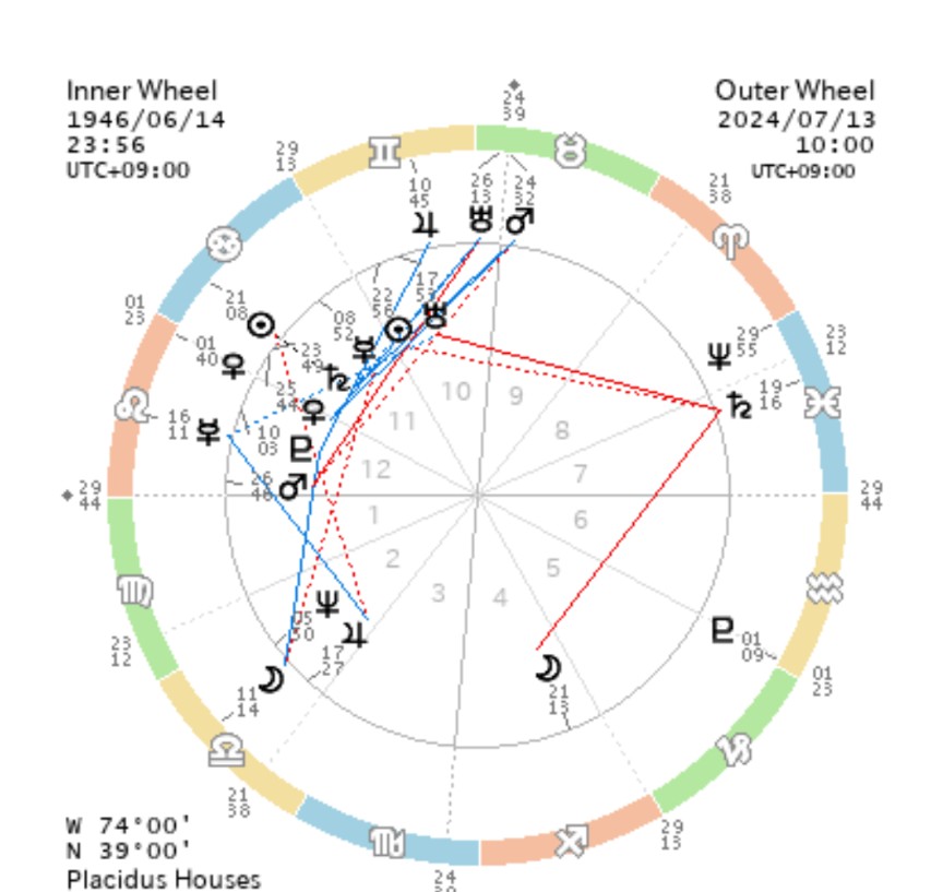 狙撃事件のあった2024年7月13日はトランプ大統領のMC、牡牛座24度に天王星と火星が通過している。火星にいたっては誤差なくドカンと乗っている。「誤差なく」は後にも先にもこの日だけだ。12日でも14日でも、ずれる。